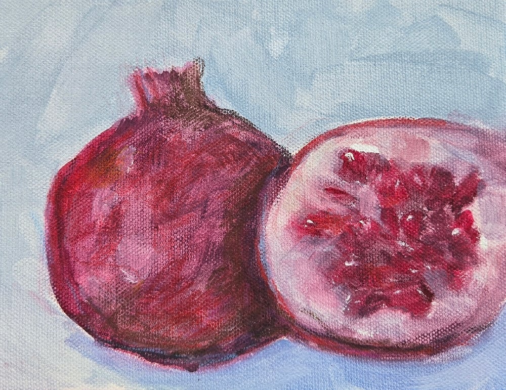 Pomegranate painted in gouache and watercolor pencils on 6x8 canvas